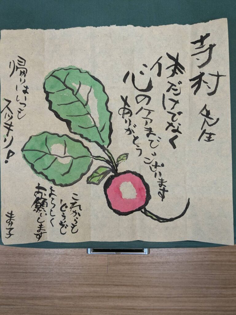 「体だけでなく心のケアまでありがとうございます」「帰りはいつもスッキリ!」こんな風に言っていただけて、治療家として本当に嬉しい限りです。味のある絵と温かい言葉に、僕のほうこそ元気をいただきました。これからも、皆さんに心身ともに楽になっていただけるよう、丁寧に施術していきます。本当にありがとうございました。